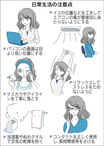 コンタクトレンズは長時間の使用を避ける。角膜の神経が鈍り、涙の分泌の反射も悪くなるからだ。乾燥しにくいシリコーンハイドロゲルのものを選ぶのも良いという。パソコンを使う場合は意識的にまばたきし、1時間に数分は画面を見ない時間をつくる。保湿眼鏡をつけたり、加湿器で部屋の湿度を保ったりすることも効果的という。