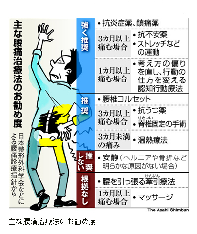 痛み止め、温熱、マッサージ、腰の牽引(けんいん)……。様々な腰痛の治療法、どれが本当に効くのか。日本整形外科学会と日本腰痛学会は、一般的な治療法の信頼度を診療指針にまとめた。白土修・福島県立医科大教授(会津医療センター準備室)らが、国内外の約200の論文を分析した。
